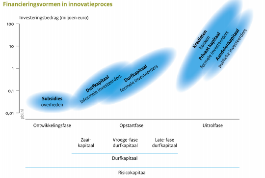 Hieronder een paar plaatjes die gaan over de processen die zich voordoen tijdens het ontwikkelen van een idee tot een volwaardig bedrijf. Zie ook het rapport van het planbureau van de leefomgeving. <DE VALLEI DES DOODS VOOR ECO-INNOVATIE IN NEDERLAND>