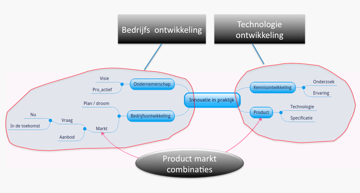 Hierboven een schets van de aspecten en disciplines waarmee je te maken krijgt als je een nieuw product door de innovatie fase wilt halen. Naast productontwikkelaar zou je dus ondernemer en wetenschapper moeten zijn. Dit lukt echter nooit in één persoon. Maar in één organisatie kan dit wel. Door de juiste mensen in een team te plaatsen wordt een namelijk veel groter gebied overzien.